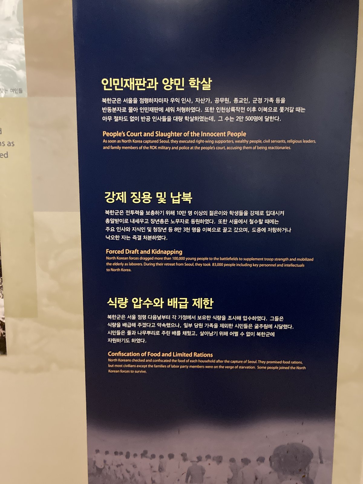 이외에도 민간인 학살을 설명하는 패널에서는 한국전쟁 당시 북한군이 자행한 일에 대해서만 간략하게 설명이 이뤄지고 있습니다. 4·3과 한국전쟁이 겹치는 시기에 벌어진 '예비검속' 민간인 학살에 대한 내용은 찾아볼 수 없었습니다. 4·3으로 육지부 형무소에 수감되었다가 자국 군·경에 의해 집단학살된 행방불명 수형인에 대한 이야기도 없었습니다. 한국전쟁에서 양측 군인에 의해 학살된 민간인의 숫자는 대략 60~100만 명에 이르는 것으로 추정되고 있습니다.