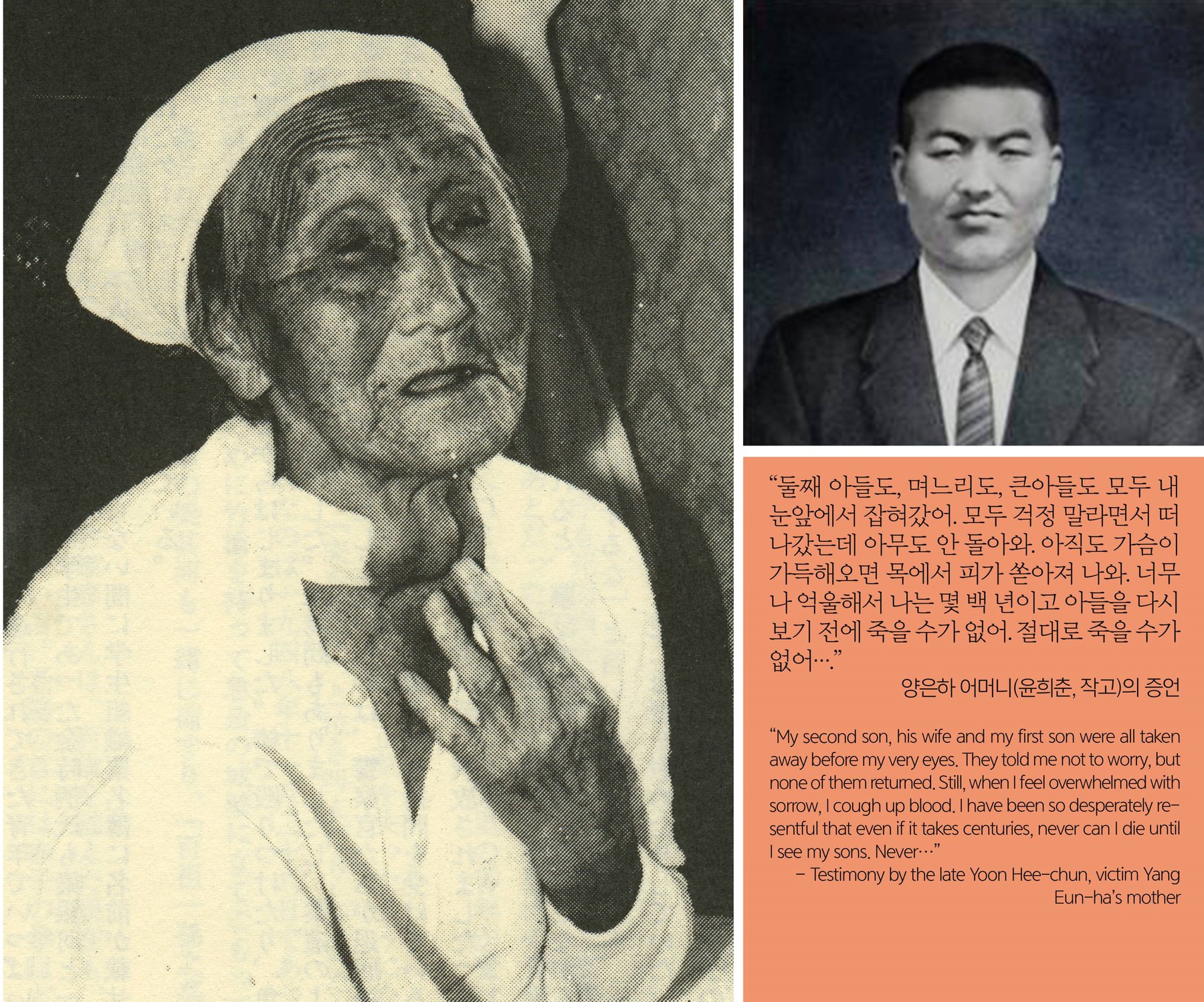 둘째 아들도, 며느리도, 큰아들도 모두 내 눈앞에서 잡혀갔어. 모두 걱정 말라면서 떠나갔는데 아무도 안 돌아와. 아직도 가슴이 가득해오면 목에서 피가 쏟아져 나와. 너무나 억울해서 나는 몇 백 년이고 아들을 다시 보기 전에 죽을 수가 없어. 절대로 죽을 수가 없어…….- 양은하의 어머니 윤희춘 할머니의 메아리 없는 절규「4·3은 말한다」1, 572-573쪽